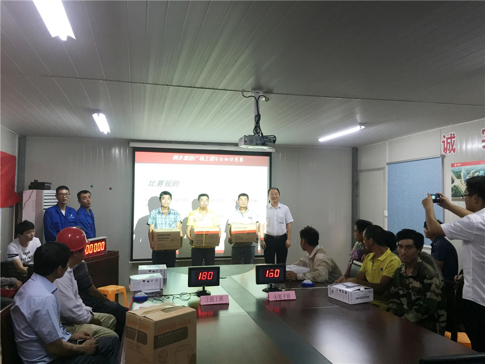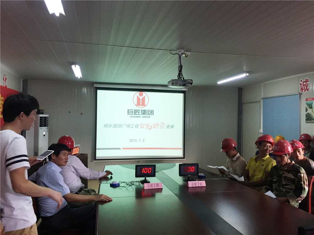 7月2日下午,桐鄉市旅游廣場工程會議室人頭撰動、掌聲不斷。這里正在舉行一場別開生面的安全知識競賽。參賽的選手全部來自施工一線的工人,參加比賽的各隊分別是泥工班組、木工班組、鋼筋工班組、架子工班組組成的四支隊伍組成。